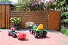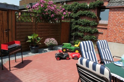 Wärend Ihre Kinder mit Bobycar und Trecker spielen, können Sie unter dem Sonnenschirm den Grill anmachen.