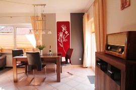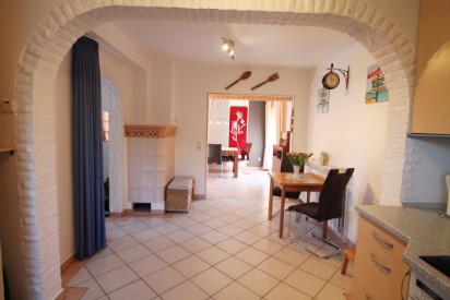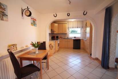 Im offenen Küchenbereich gibt es eine kleine Sitzmöglichkeit mit Tisch und 2 Stühlen.